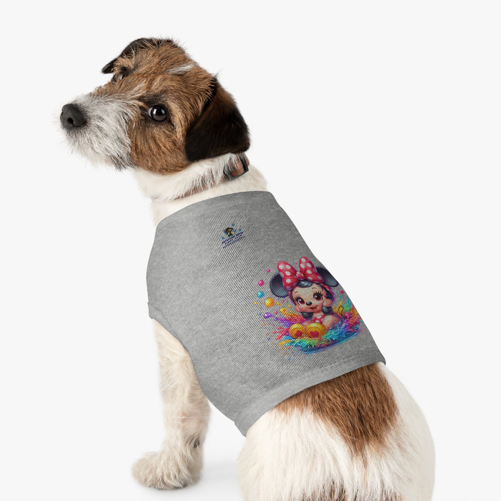 A playful, colorful pet tank that brings a splash of childhood wonder to your pup's walks. Soft, smooth cotton and a stretchy rib knit let the tank move with curious tails and bouncing steps. The bright cartoon character print — polka-dot bow, mouse ears and rainbow splashes — reads like a joyful moment frozen mid-splash, turning everyday errands into small adventures. Lightweight but structured, the tank keeps its shape through cuddles and play, and the EasyTear™ label keeps necks happy. Recommend sizing up for broad-chested breeds so comfort and fit stay as carefree as the design.