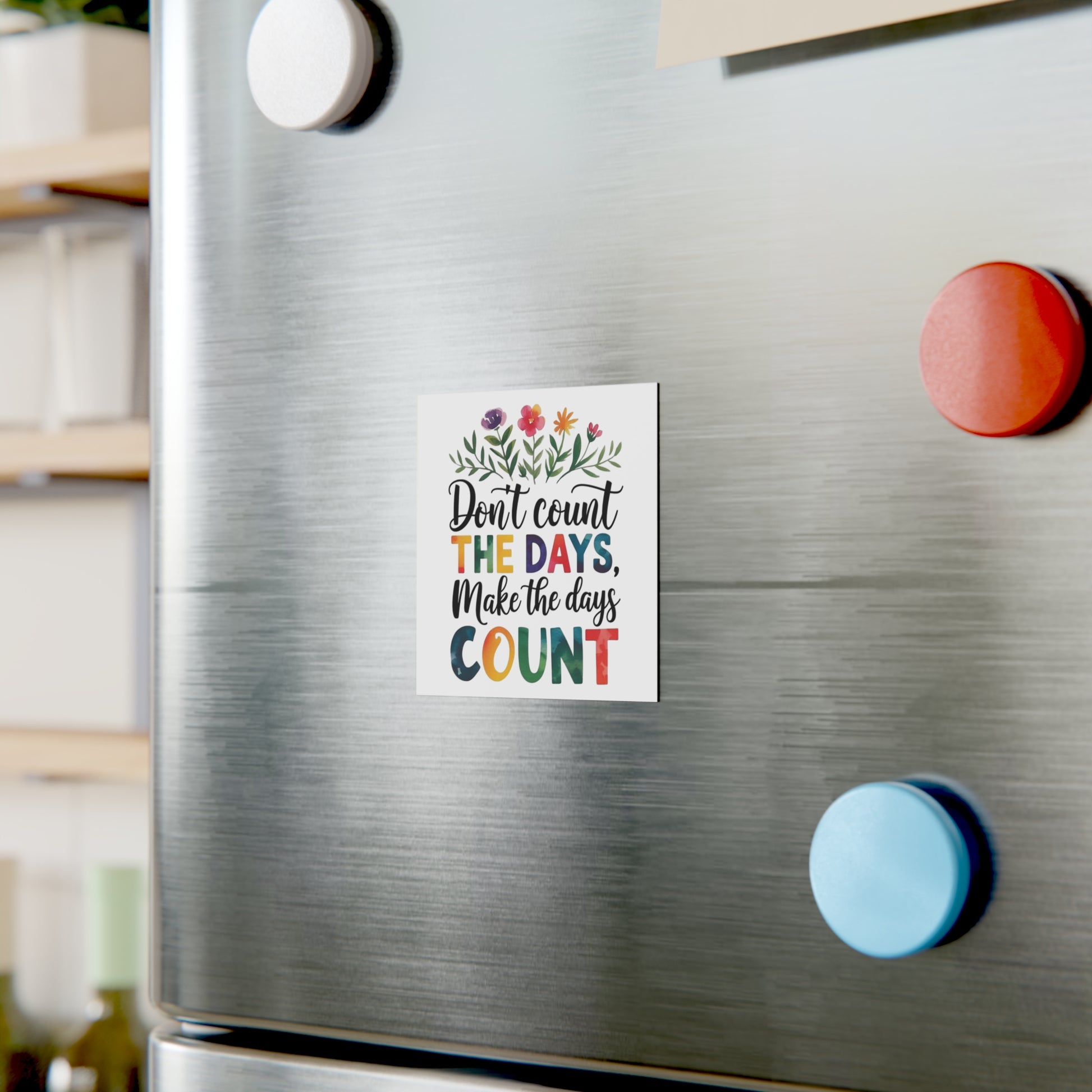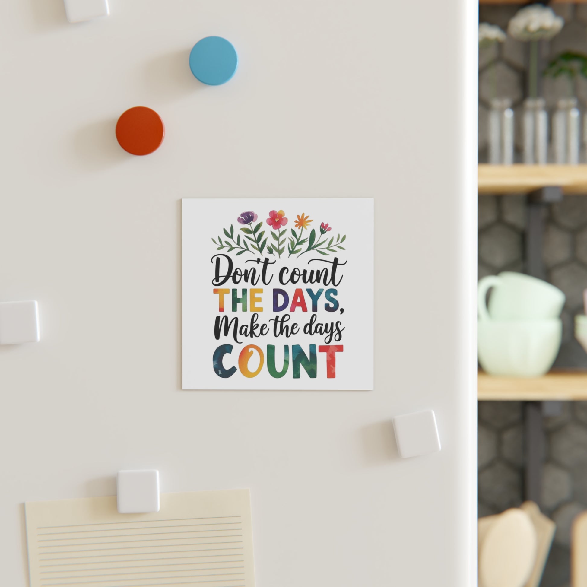 Bright, square magnets that add a little spark to fridges, lockers, or car doors. The cheerful design—hand-lettered script with a rainbow block-letter accent and a crown of watercolor florals—carries a gentle, motivational message: “Don’t count the days, make the days count.” The matte white face keeps colors vivid without glare, while the sturdy magnetic backing and weatherproof UV inks mean this small reminder can travel from kitchen to camper to car and keep looking fresh. Lightweight and flexible, it clings securely to any metal surface and comes in two compact sizes to fit wherever you want a burst of color and encouragement.