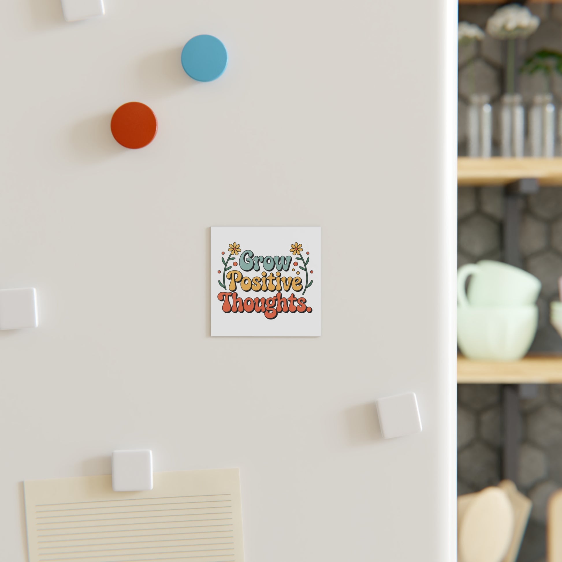 This square magnet brings a warm, retro-sunshine vibe to everyday surfaces. Cheerful hand-lettering reads “Grow Positive Thoughts.” framed by simple floral doodles in soft greens, golds, and coral — colors that feel like a slow morning and a deep breath. The matte, stipple-textured finish mutes glare and gives the artwork a tactile, printed-on-paper look, while a sturdy magnetic backing holds it steady on fridges, file cabinets, or car bumpers. Place it where you’ll see it first thing: a small, gentle nudge toward better days whenever you need one.