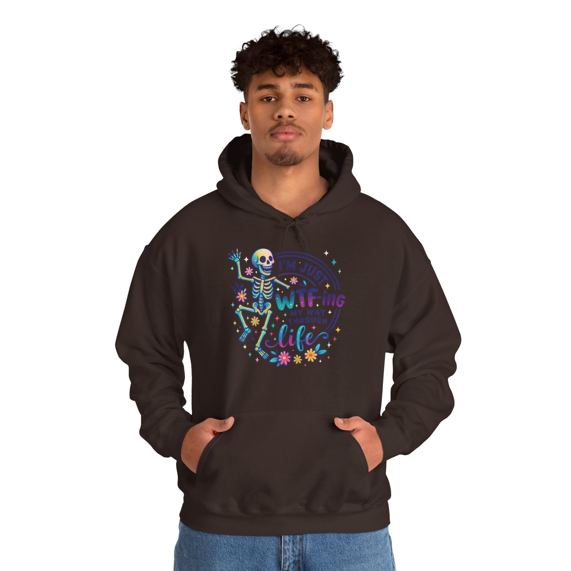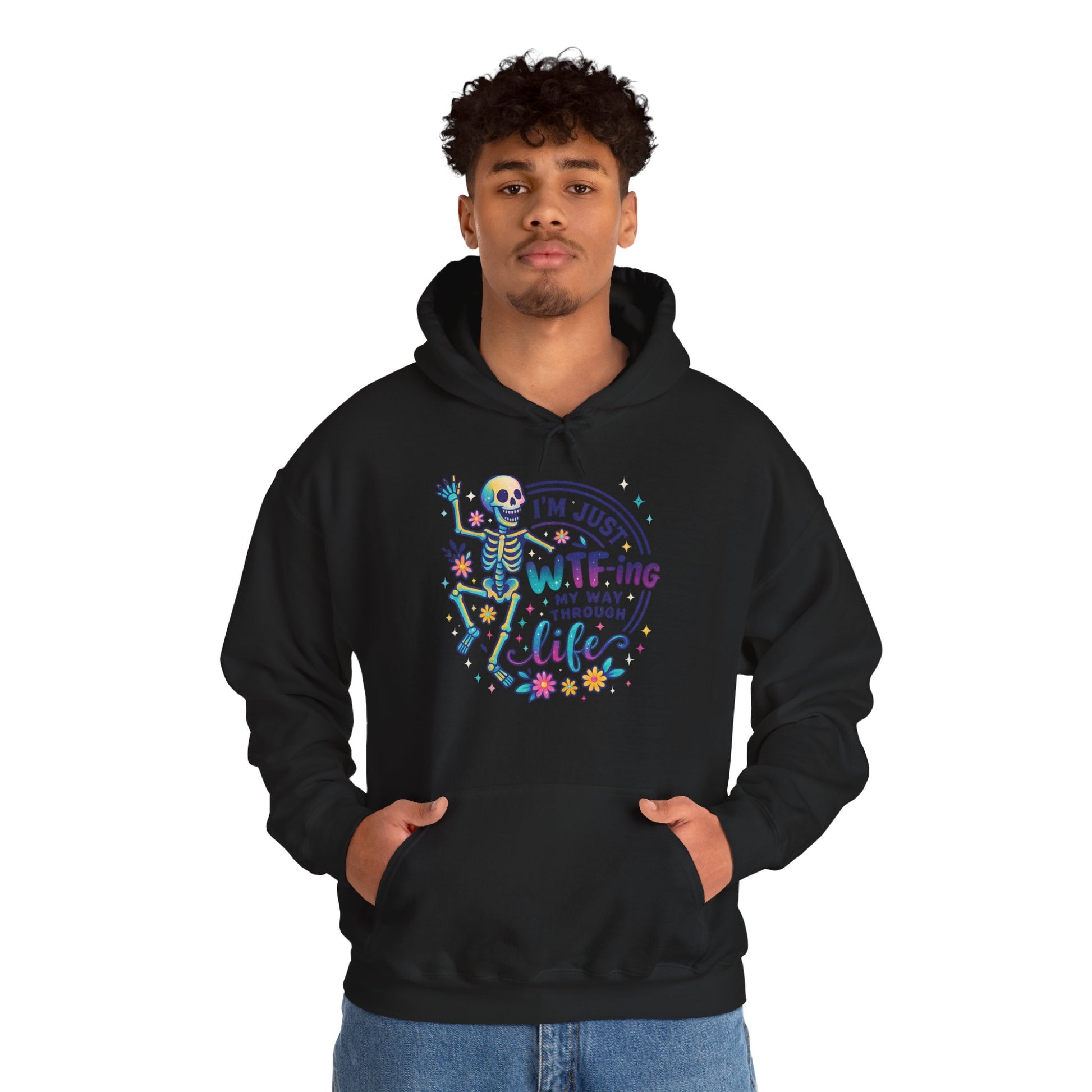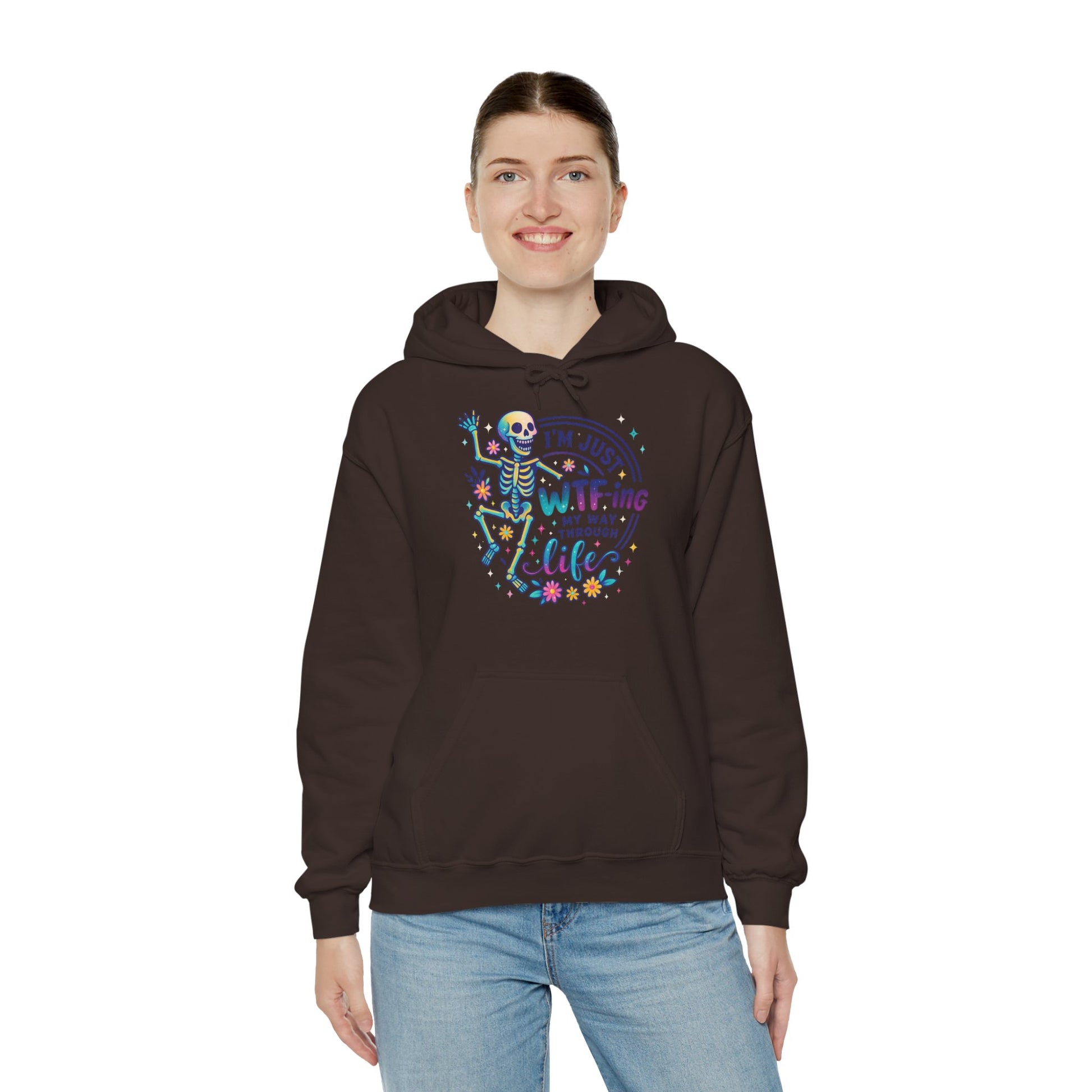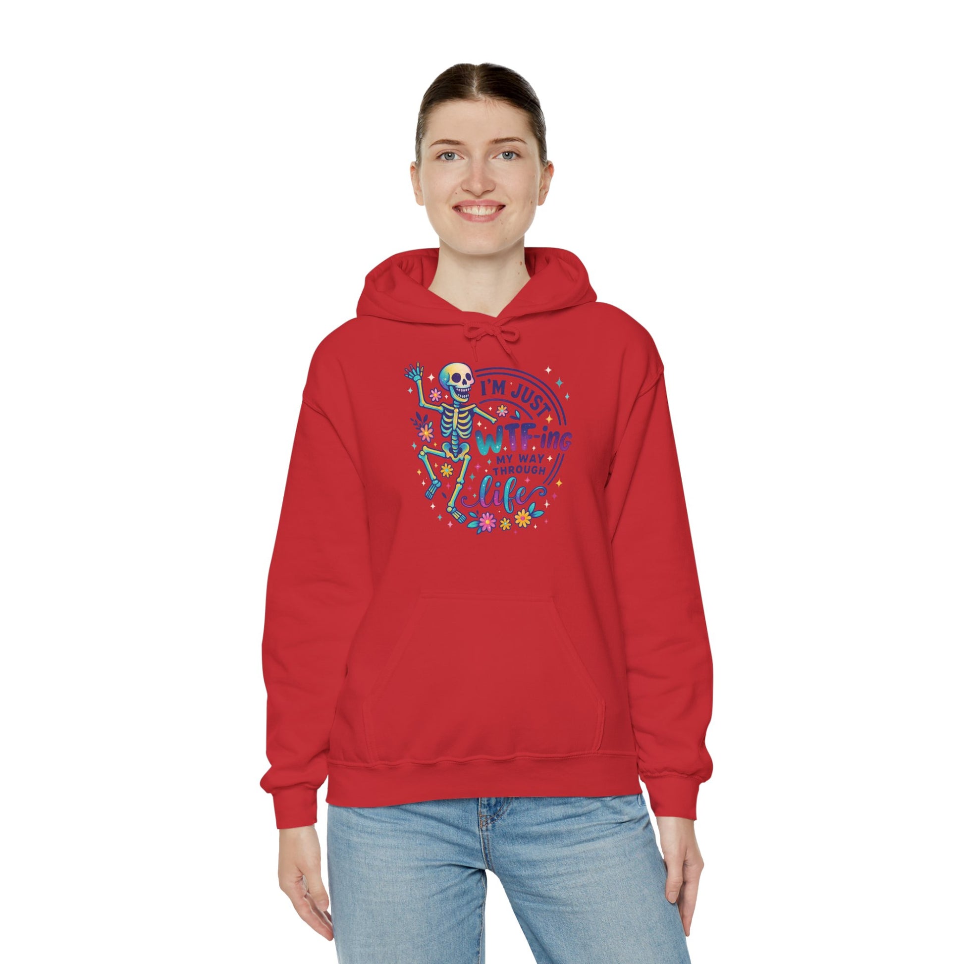 A soft, cozy hoodie that pairs lighthearted grit with playful color. The front features a vibrant skeleton illustration dancing around the phrase “I’m just WTF-ing my way through life,” surrounded by tiny florals and confetti-style accents. The graphic feels equal parts sarcastic and sweet — a wearable shrug for days when humor is the best coping tool. Cut with a roomy, classic fit and a double-lined hood, this hoodie drapes easily over layers and keeps the pouch pocket ready for cold hands or loose change. It settles into everyday life: worn on late-night drives, quiet porch mornings, or while binge-watching and commiserating with friends. The design speaks to people who meet chaos with a wink and a colorful playlist.