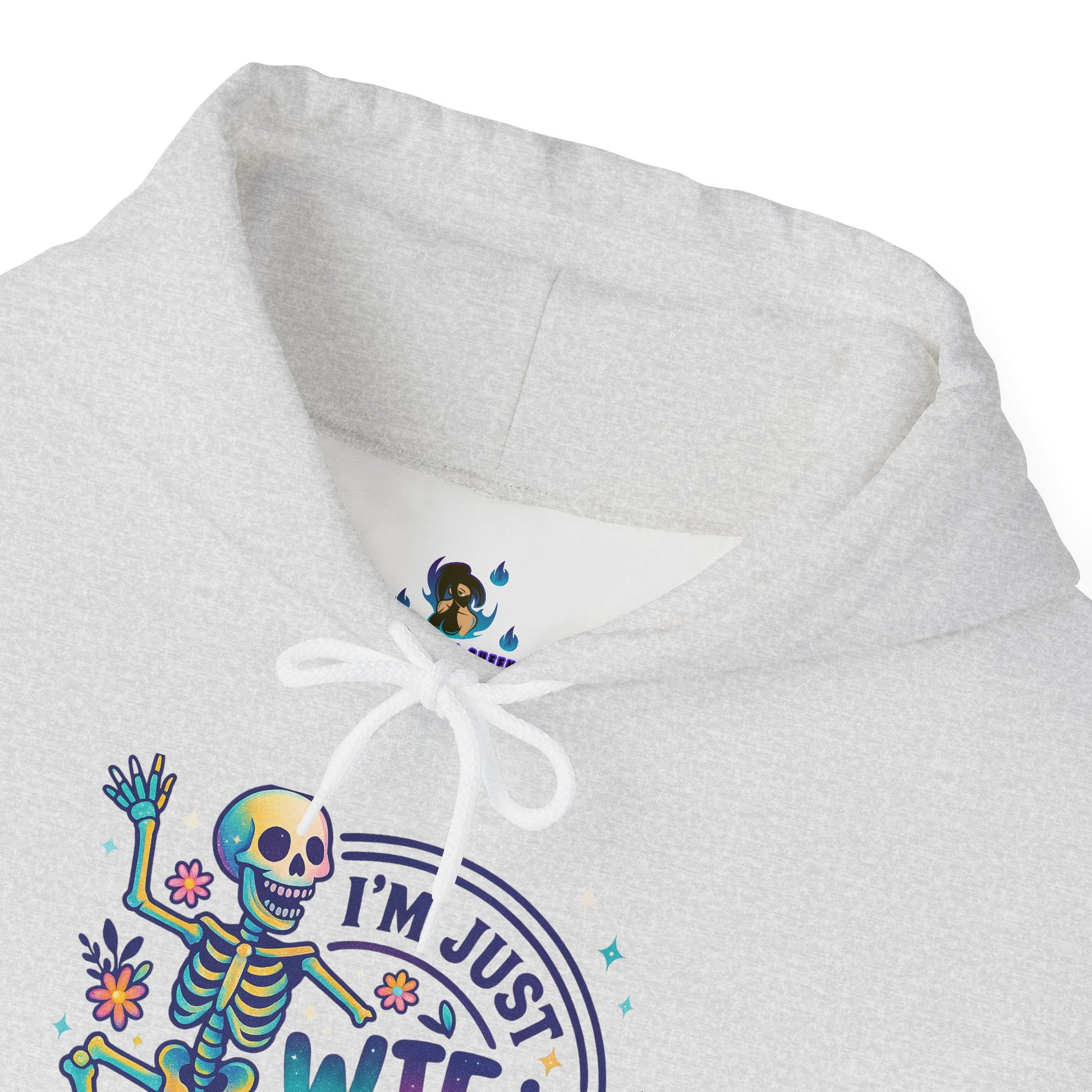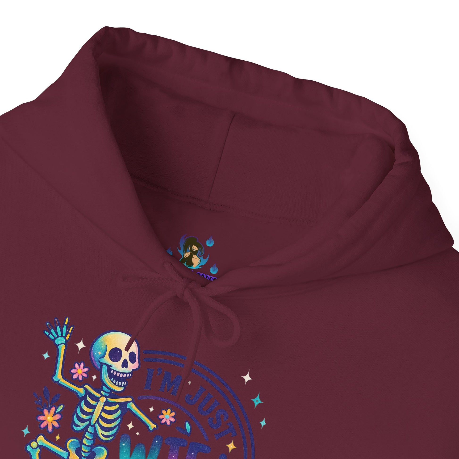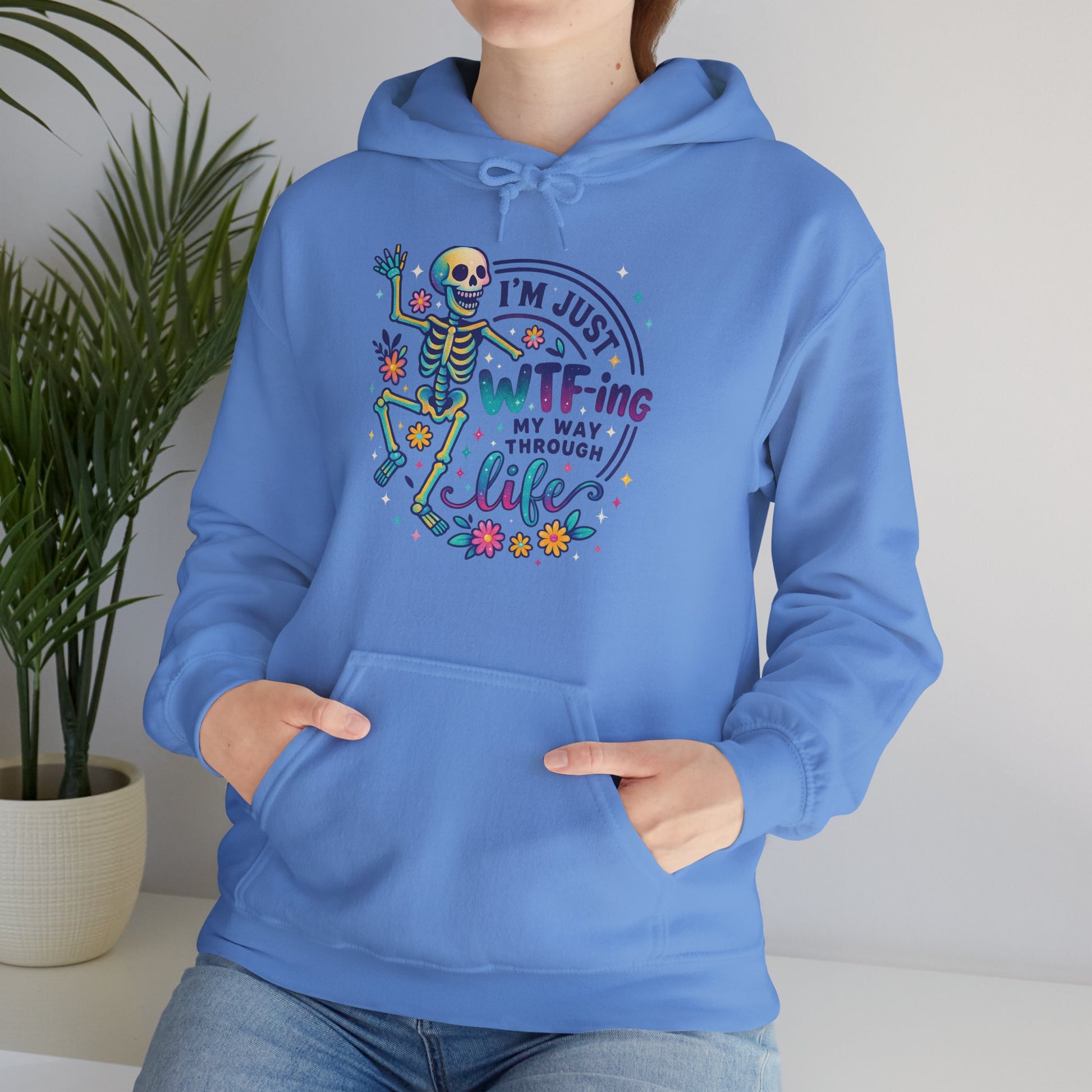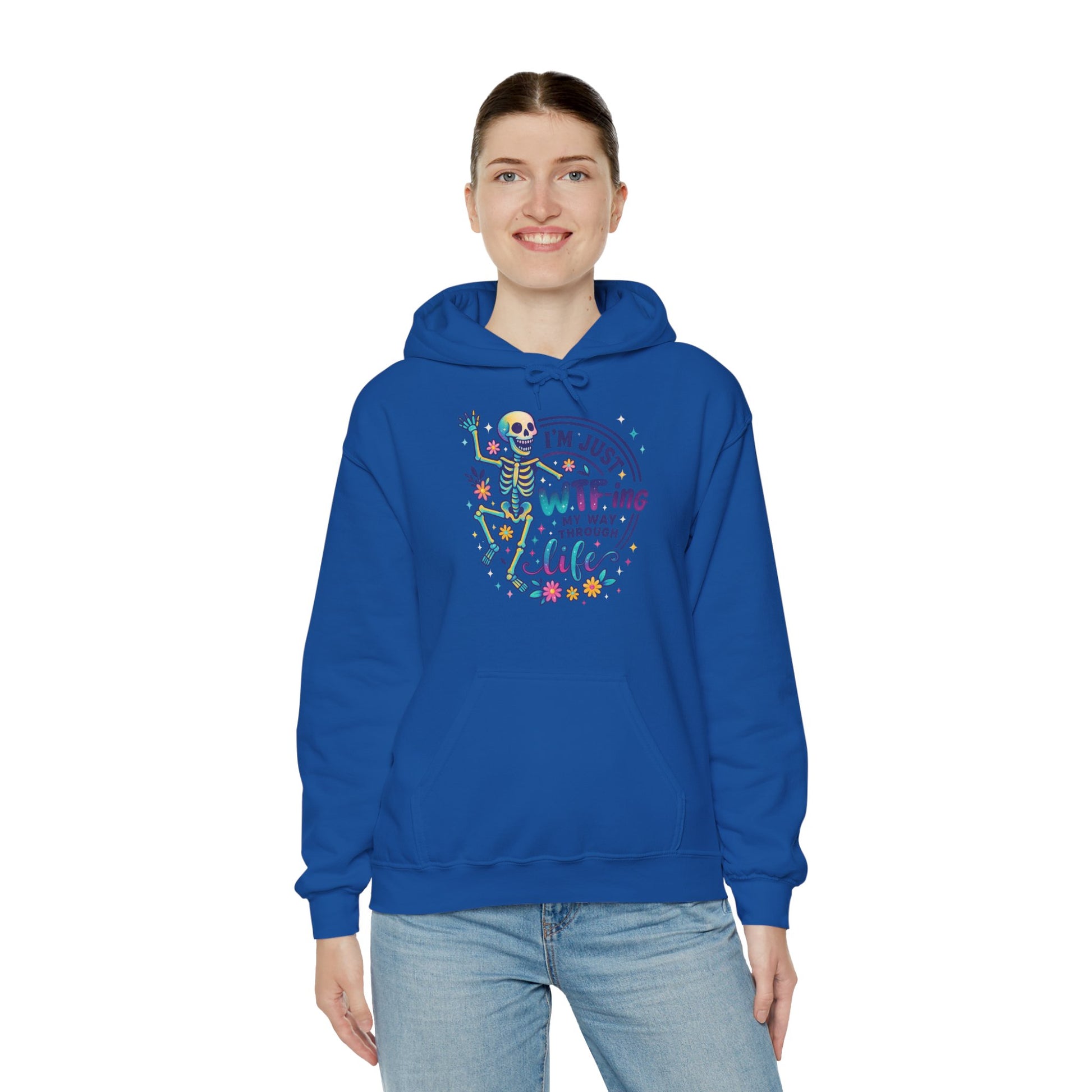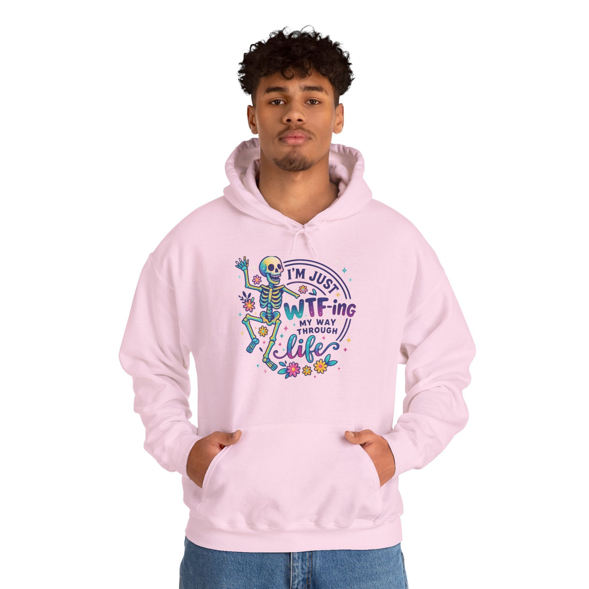A soft, cozy hoodie that pairs lighthearted grit with playful color. The front features a vibrant skeleton illustration dancing around the phrase “I’m just WTF-ing my way through life,” surrounded by tiny florals and confetti-style accents. The graphic feels equal parts sarcastic and sweet — a wearable shrug for days when humor is the best coping tool. Cut with a roomy, classic fit and a double-lined hood, this hoodie drapes easily over layers and keeps the pouch pocket ready for cold hands or loose change. It settles into everyday life: worn on late-night drives, quiet porch mornings, or while binge-watching and commiserating with friends. The design speaks to people who meet chaos with a wink and a colorful playlist.