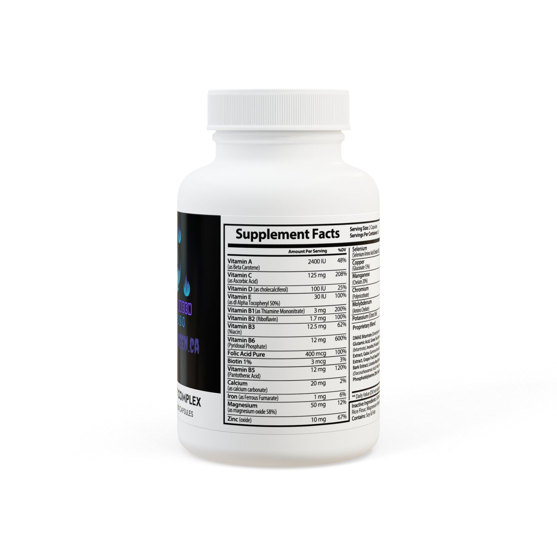 Ingredients: Vitamin A (as Beta Carotene), Vitamin C (as Ascorbic Acid), Vitamin D (as cholecalciferol), Vitamin E (as dl Alpha Tocopheryl 50%), Vitamin B1(as Thiamine Mononitrate), Vitamin B2 (Riboavin), Vitamin B3 (Niacin), Vitamin B6 (Pyridoxal Phosphate), Folic Acid Pure, Biotin, Vitamin B5 (Pantothenic Acid), Calcium (as calcium carbonate), Iron (as Ferrous Fumarate), Magnesium (as magnesium oxide 58%), Zinc (oxide), Selenium (Selenium Amino Acid Chelate 0.2%), Copper (Gluconate 13%), Manganese (Chelate 20%), Chromium (Polynicotinate), Molybdenum (Amino Chelate), Potassium (Citrate 36%), DMAE Bitartrate (Dimethylaminoethanol), L Glutamine, Glutamic Acid, Green Tea Extract, Bacopa Extract, Choline (bitartrate), Inositol, N-Acetyl L-Tyrosine, Bilberry Fruit Extract, Gaba (Gamma Aminobutyric Acid), Grape Seed Extract, Grape Fruit Seed Extract, Olive Leaf, Cinnamon Bark Extract, Licorice Root Extract, Boron (Citrate), DHA (Docosahexaenoic Acid) 14%, Vanadyl Sulfate 19%, Phosphatidylserine 20%, Huperzine A. Inactive Ingredients: Cellulose (Vegetable Capsule), Rice Flour, Magnesium Stearate, Silicon Dioxide. Contains: Soy & Fish