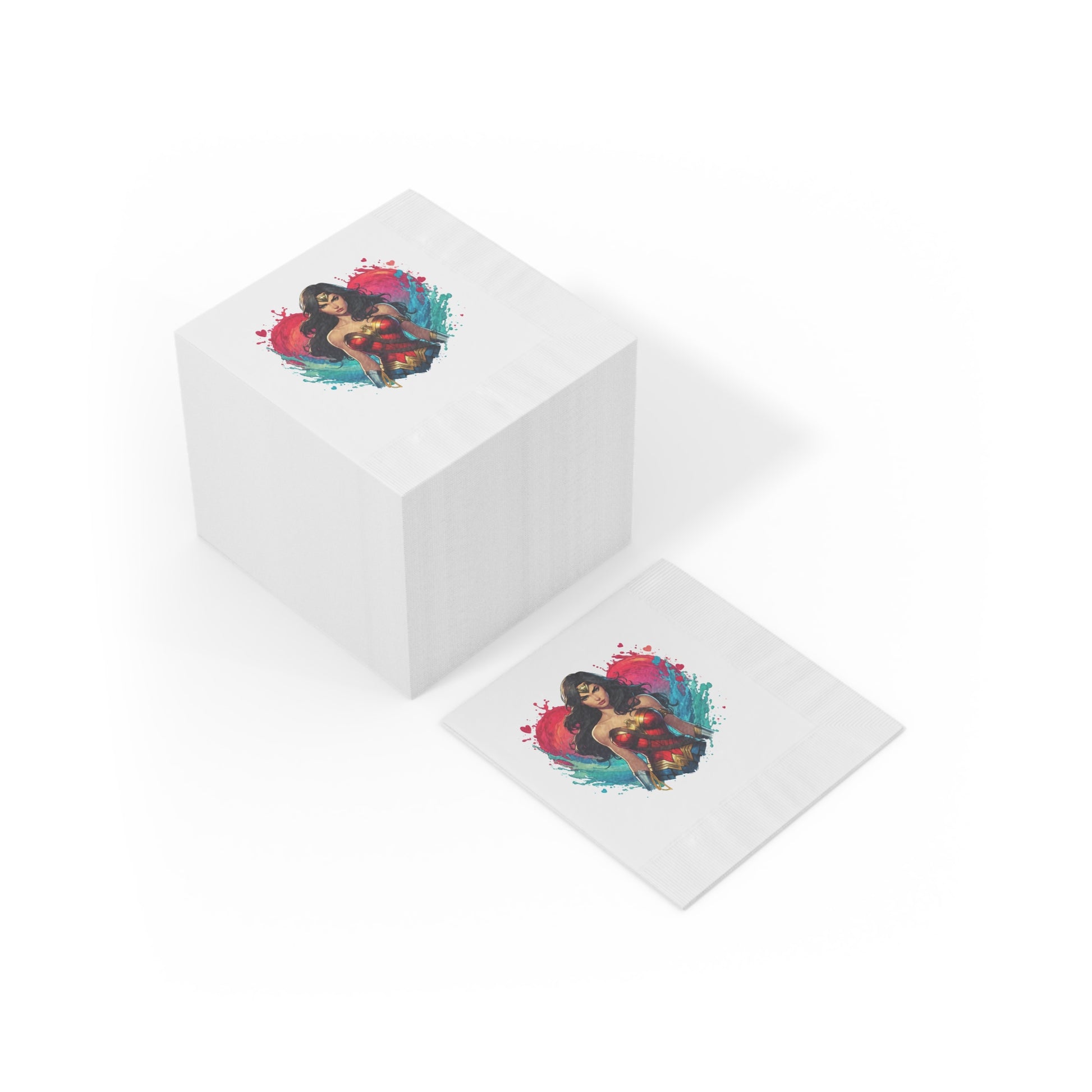 These printed white paper napkins bring bold color and playful detail to casual gatherings. The three-ply, soft texture feels substantial while the coined edge framing adds a tidy, finished look. A small, vibrant illustration sits near one corner, surrounded by painterly splashes of red and teal that brighten the table without overwhelming it. Use the luncheon size for plated snacks and the beverage size for cocktails and small bites. Packs of 50 or 100 make restocking simple for parties, meetings, or promotional events. Note: some faint ink shadowing or tiny specks at the edge can occur with the printing process, giving each run a bit of texture and character.