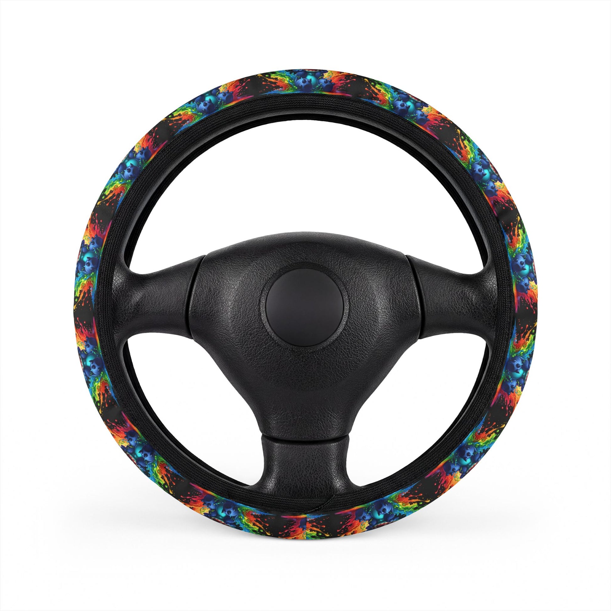 Slide this vibrant steering wheel cover into place and let color lead the way. The soft neoprene wrap hugs your wheel with a secure, non-slip grip that keeps every turn confident and controlled. The all-over, tie-dye–inspired print brings a playful, expressive energy to the cockpit — bright blues, fiery oranges, and deep greens blending like a moving aurora around your hands. It feels slightly cushioned under the palms, dampening road buzz without losing steering feedback. Installation is quick: stretch, align, and fit — no tools required. The eco-conscious polyester material resists wear and cleans easily, so the pattern stays bold through daily drives, weekend escapes, and late-night errands.